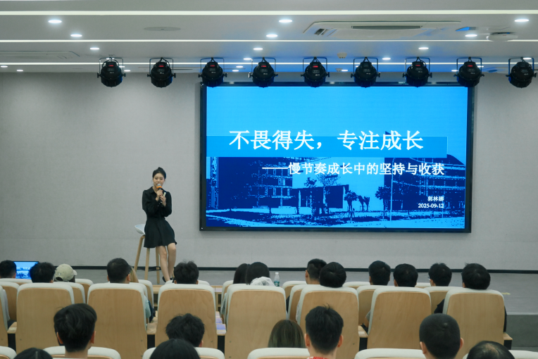 分享会伊始,23届社会设计系毕业生、现上海立达学院专任教师郭林娜以《不畏得失,专注成长——慢节奏成长中的坚持与收获》为题,结合个人成长经历,从五个关键词与两条建议出发,深入探讨在当下快节奏环境中如何坚持自我、逐步积累,实现稳步成长。她的分享鼓励同学们不畏得失,耐心对待成长中的每一步。