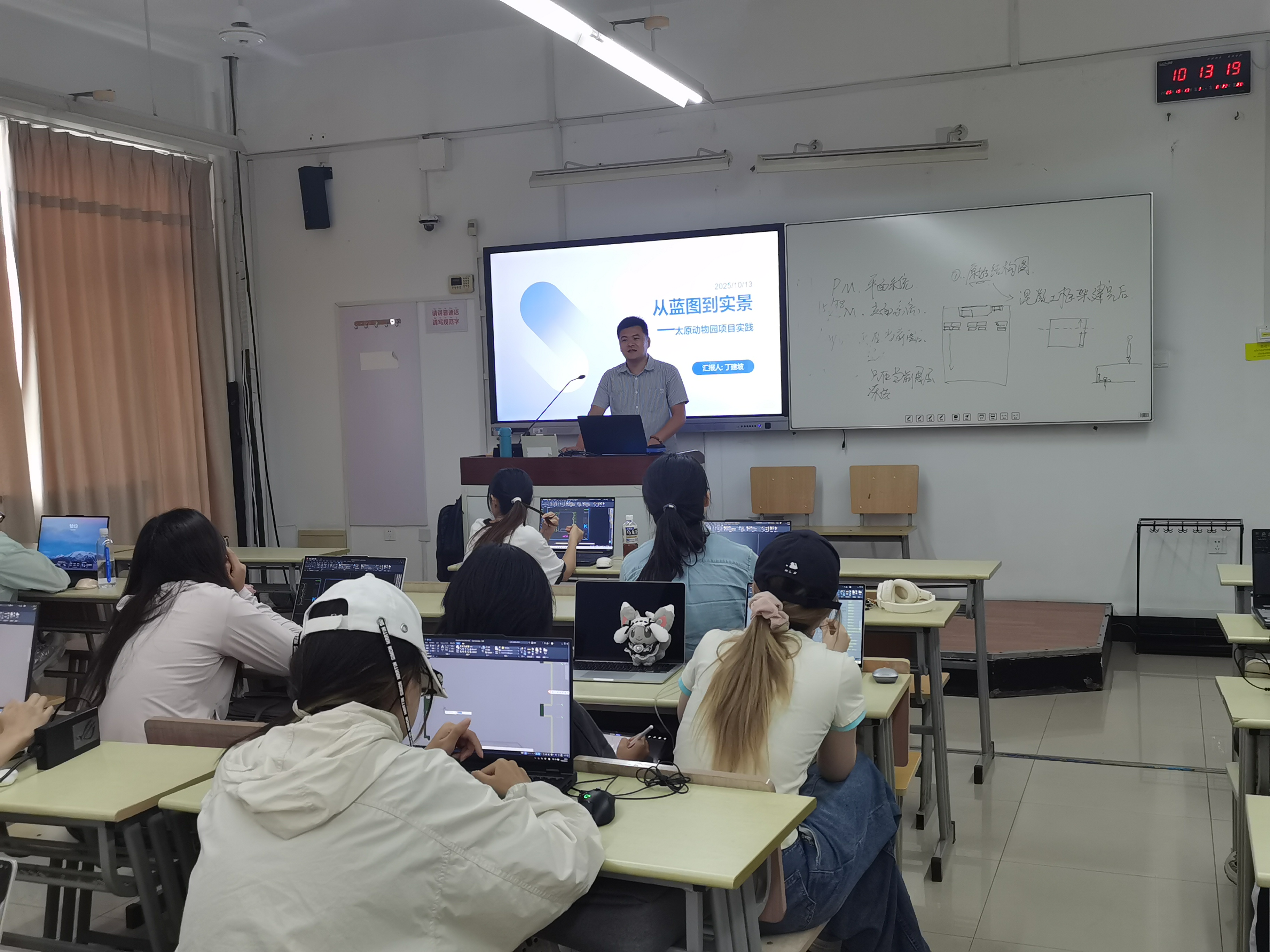 2025年10月13日,《计算机辅助设计》课程主讲教师李云鹏邀请设计师丁建坡开展以“从蓝图到实景:太原动物园设计”为主题的专题分享,本次讲座旨在搭建一个与行业一线专家对话的桥梁。在长达一个半小时的讲座中,丁老师以其亲身经历的真实项目——太原动物园设计为案例,生动详尽地剖析了一个设计项目从最初的构思蓝图,最终如何一步步转变为触手可及的现实空间的完整流程。