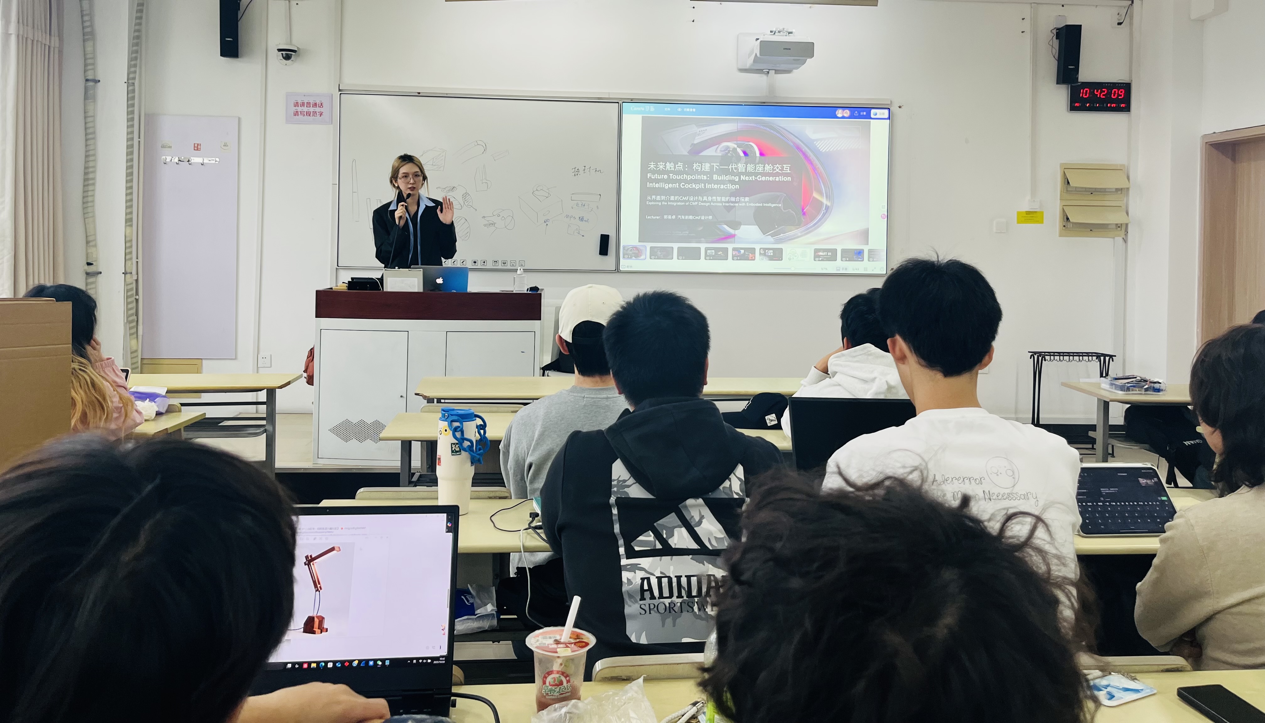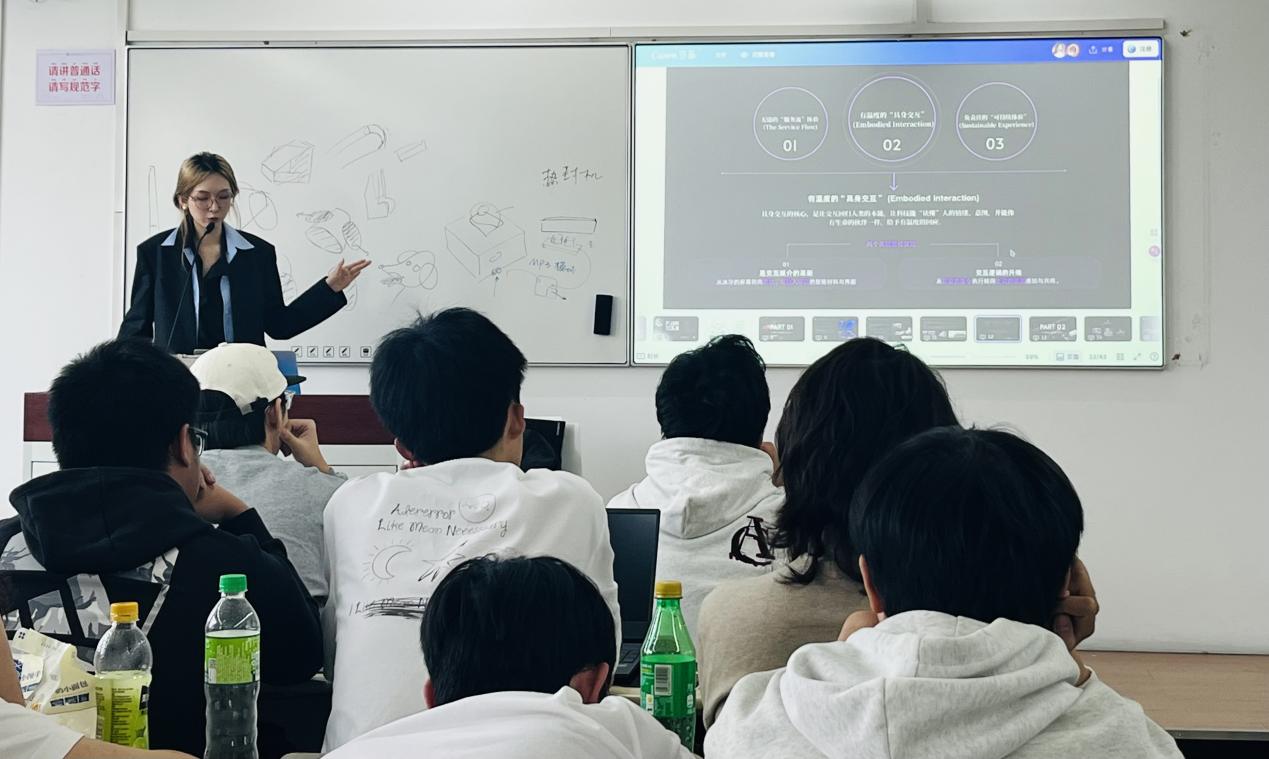 2025年10月20日,课程特邀跨学科设计师、材料创新研究者、上汽通用五菱前瞻中心CMF设计师郭易卓走进课堂,以《智能座舱CMF设计与未来交互触点创新》为题,为工业设计专业员工解锁智能汽车领域的前沿技术与设计逻辑,搭建起课堂理论与产业前沿实践的桥梁。
