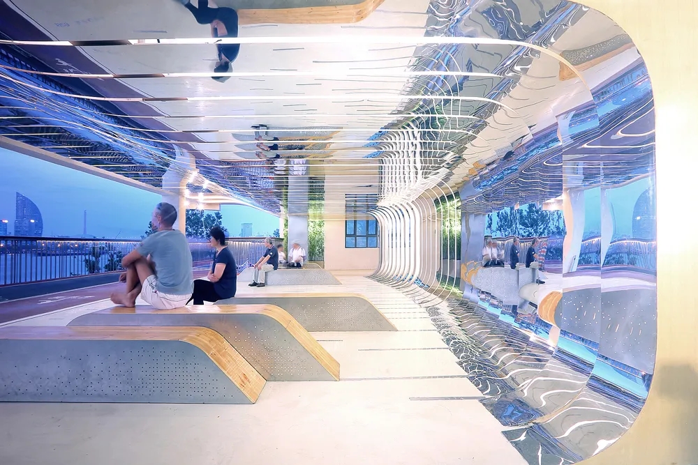 孙博士以位于其昌栈的“浦江之镜”项目为例,展示了如何通过大幅镜面材料与流畅曲线,将顶棚、墙面与地面融为一体,打造出独具魅力的光影空间。白天,镜面反射增强空间明亮感;夜晚,灯光与镜面交相辉映,营造出富有艺术气息的公共环境。该空间不仅为轮渡乘客提供免费饮水和休憩设施,更成为市民欣赏江景、享受视觉盛宴的“城市客厅”。