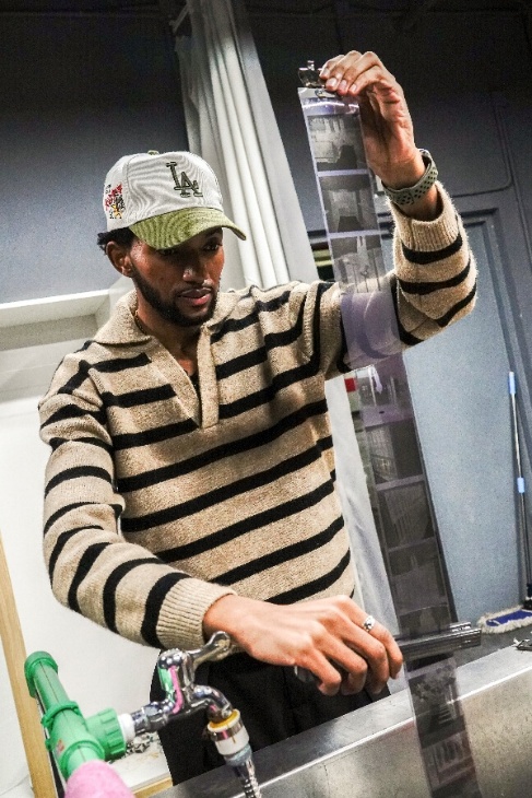 在经过1小时的拍摄后,员工们回到博物馆内的黑白暗房工作室里,将拍摄完毕的胶卷从相机中取出并放入暗袋,在经过多次模拟练习后顺利的在暗袋中将胶卷装入显影用的冲洗罐内。接着员工来到水池前,将调配好的药水按照技术要求缓慢的倒入显影罐内,在经过约20分钟的显影与定影,一卷冲洗标准、影像清晰的黑白胶片展现在员工面前。员工使用海绵夹将轻轻地将底片上的水分沥干,整个过程受到了指导教师的夸张,动作手法不输专业人士。
